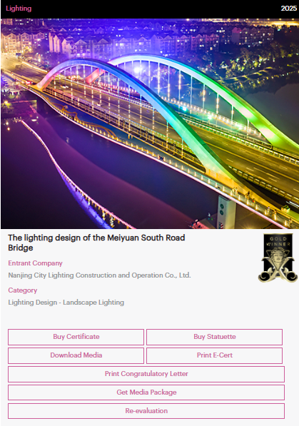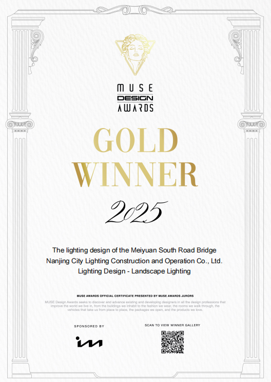 照明集團梅苑南路跨秦淮新河大橋夜景照明項目榮獲2025年Muse設計獎照明類金獎近日,2025年美國繆斯設計獎(Muse Design Awards)獲獎名單揭曉,由南京照明集團下屬南京路燈工程建設有限責任公司設計、江蘇馨玥照明科技有限公司施工的梅苑南路跨秦淮新河大橋夜景照明項目,憑借古今融合的設計、精湛技術(shù)與城市肌理契合的景觀表達,斬獲照明類金獎。
