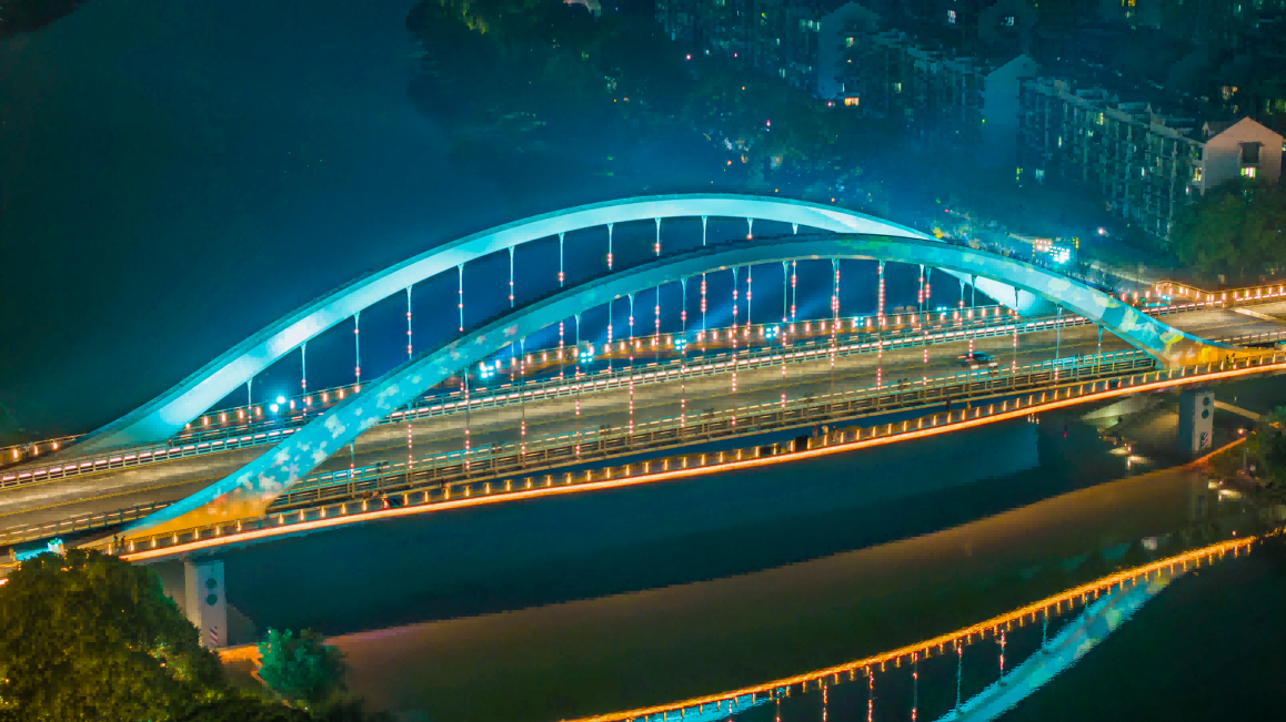 二、技精藝巧,光影織境 在技術(shù)呈現(xiàn)上,項目構(gòu)建了多層次、全維度的照明體系,盡顯匠心巧思。橋梁主拱內(nèi)外側(cè)采用智能染色投光燈與投影燈,顏色與圖案緩慢漸變,精準勾勒出拱形結(jié)構(gòu)的恢弘輪廓與靈動線條;拉索上安裝點光源,營造出呼吸、爆閃的動態(tài)效果,為鋼鐵結(jié)構(gòu)注入靈動生命力,與河水漣漪相映成趣;機動車道與非機動車道采用LED護欄燈實現(xiàn)功能性照明,形成均勻光帶,有效避免眩光,保障行車安全與舒適;橋外側(cè)洗墻燈勾勒整體形態(tài),兩岸全息風扇燈打造3D空氣成像效果,虛實交織間成就層次豐富的視覺盛宴。